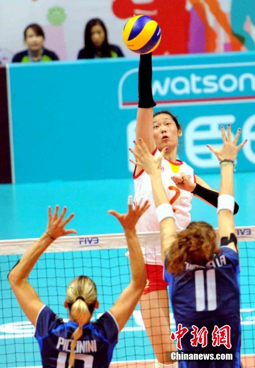 8月10日,2014年世界女排大奖赛香港站的比赛下午继续在香港体育馆举行,中国女排以局数三比一战胜意大利,三战全胜,赢得冠军。中新社发 谭达明 摄