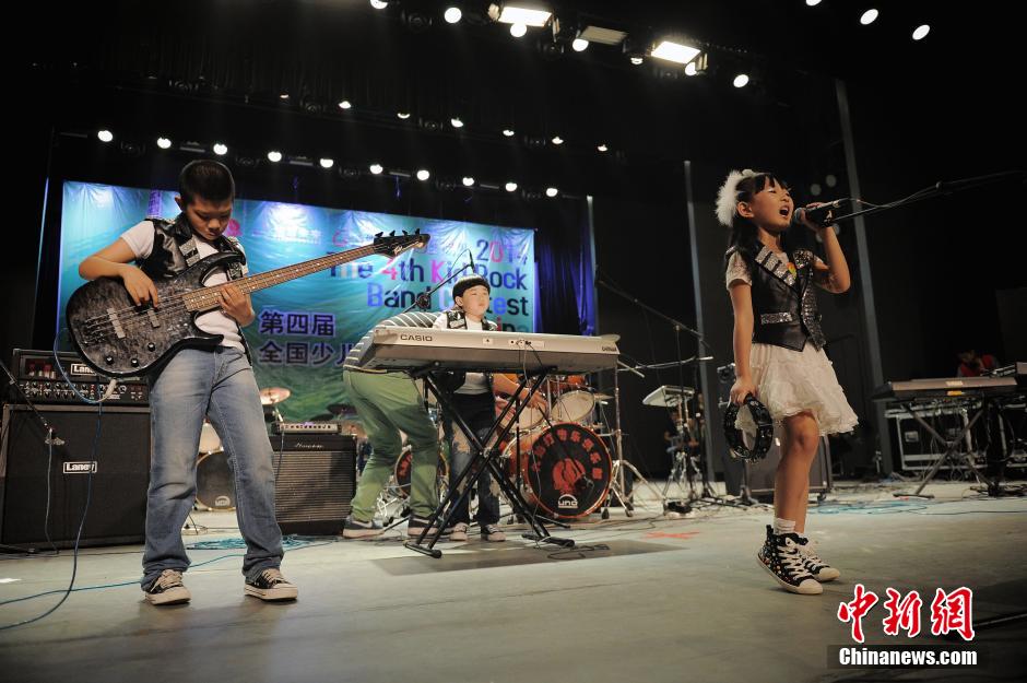 8月10日,少儿摇滚乐手们在现场角逐。当天,第四届全国少儿摇滚乐大赛在天津举行,来自中国各个省市的16支少儿摇滚乐队进行了激烈的比赛。随着现代音乐在中国的普及和发展,少儿摇滚热近几年已经成为中国乐坛关注的现象,更多的家长选择了让孩子学习架子鼓、吉他、贝司等现代音乐提升孩子内在的综合素质能力。佟郁 摄