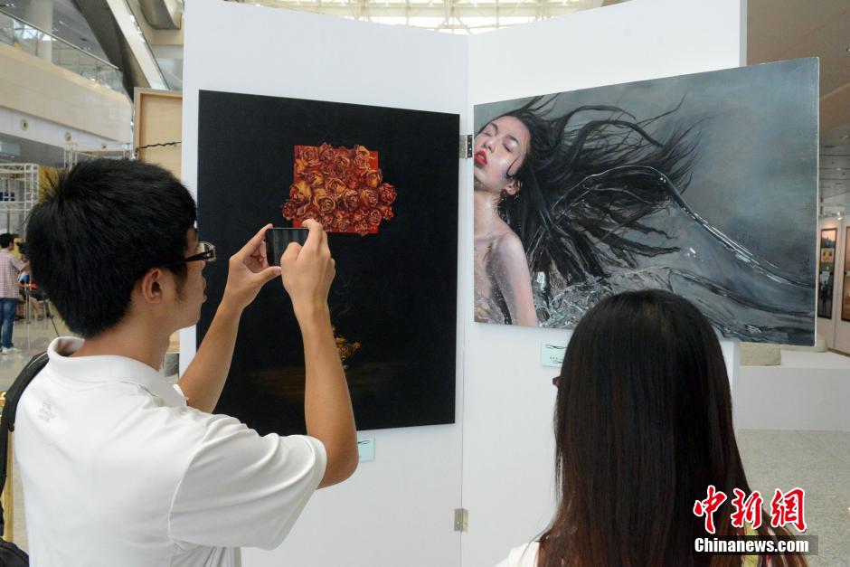8月10日,正在福州举行的第二届海峡青年节,秉持“两岸一家亲”理念,以“中国梦?中华情”为主旋律,以“海丝起点,青春启航”为主题,安排大会、文化交流、公益交流等16项活动,邀请了1800多名两岸青年共同参加,其中台湾青年约800人。当日,在福州海峡国际会展中心举行的两岸青年文化创意展、中华传统文化体验展,每个展品都闪烁着两岸青年的创新思维,吸引众多两岸青年代表观展。图为两岸大学生美术设计展吸睛。 刘可耕 摄