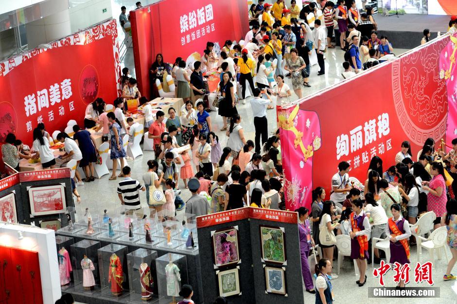 8月10日,正在福州举行的第二届海峡青年节,秉持“两岸一家亲”理念,以“中国梦?中华情”为主旋律,以“海丝起点,青春启航”为主题,安排大会、文化交流、公益交流等16项活动,邀请了1800多名两岸青年共同参加,其中台湾青年约800人。当日,在福州海峡国际会展中心举行的两岸青年文化创意展、中华传统文化体验展,每个展品都闪烁着两岸青年的创新思维,吸引众多两岸青年代表观展。图为两岸大学生服装文化创意设计展吸引众多两岸大学生参与互动。 刘可耕 摄