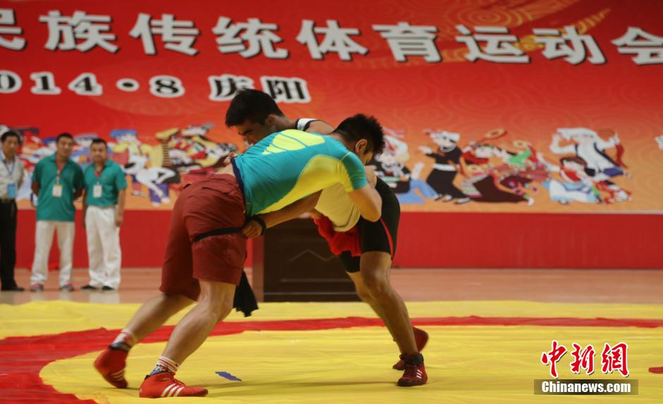 8月10日,甘肃省第八届少数民族传统体育运动会在革命老区甘肃庆阳开幕。本届民运会共设有8个竞赛项目,即民族式摔跤、武术、押加、陀螺、高脚竞速、板鞋竞速、射弩、民族健身操。表演项目则为东乡族拔棍、保安族夺腰刀、藏族锅庄舞、裕固族顶杠子、维族踢踏舞等。本届民运会,对各代表团的成绩不排名,不设金牌榜,成为了各民族民众的聚会。 丁思 摄