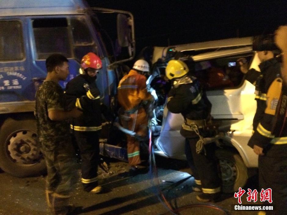 11日22时许,哈尔滨老机场路姜家屯附近路段发生一起重大交通事故,一辆微型面包车和一辆货车相撞,面包车上8人当场死亡,事故原因正在调查中。 中新社发 解培华 摄