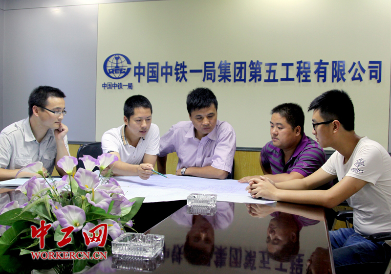 结束了测量任务,回到单位已经是下午1点过了。吃过午饭后,白芝勇和他的测量小分队和测量队领导在一起研究晋中南铁路轨道精调的测量方案。 中工网通讯员李先 摄