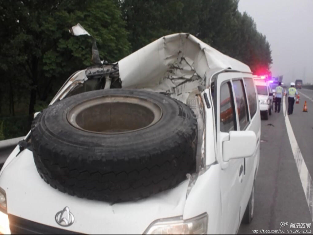 近日连霍高速上,一只“不明飞胎”将一面包车车头砸扁。