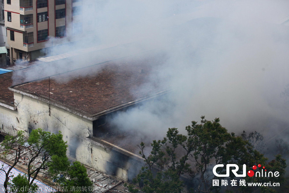 2014年8月12日,海南省海口市,海府路金鹿灯饰大世界3间铺面及相邻的金鹿农贸市场发生火灾,起火点建筑物、老菜市场及灯饰等相连的十几间铺面在“火烧连营”,过火面积近1000平方米,该起火灾未造成人员伤亡。据灯饰店主透露,据初步计算,3间灯饰铺面着火损失至少约600万元。 图片来源:高林/东方IC