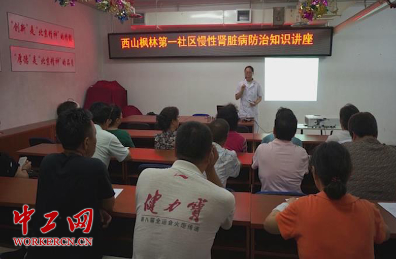 我国肾脏和糖尿病的发病率近年来持续上升,而防治知识的知晓率却很低,这样的现状就给肾脏病和糖尿病的防治造成了很大的障碍。近日,首都医科大学附属北京康复医院肾内及内分泌科就走进石景山区西山枫林第一社区,为居民开展慢性肾脏病和糖尿病防治知识讲座。(中工网记者杨灵 摄)