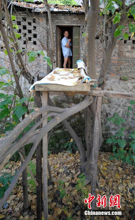 2014年8月13日,重庆。一栋老式居民楼的住户,为了方便出行,用木棒支撑,在离地3米多高的地方搭建了天桥,直接通往滨江路上。