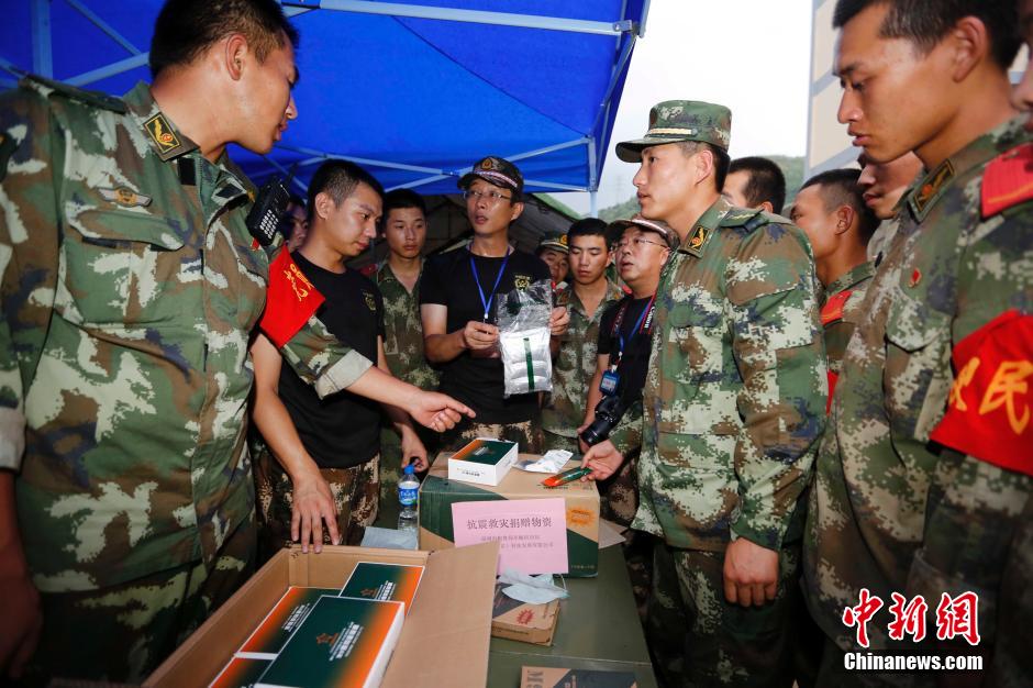 日前,昆明市粮食局军粮供应站紧急从昆明调运由总后专利发明的M9通用能量棒,赠送给武警云南总队鲁甸抗震救灾部队,解决官兵在偏远受灾点救灾的应急供给问题,受到了在震中一线抗震救灾官兵的热烈欢迎。图为工作人员讲解自热食品使用方法和食用方法。 中新社发 李善明 摄