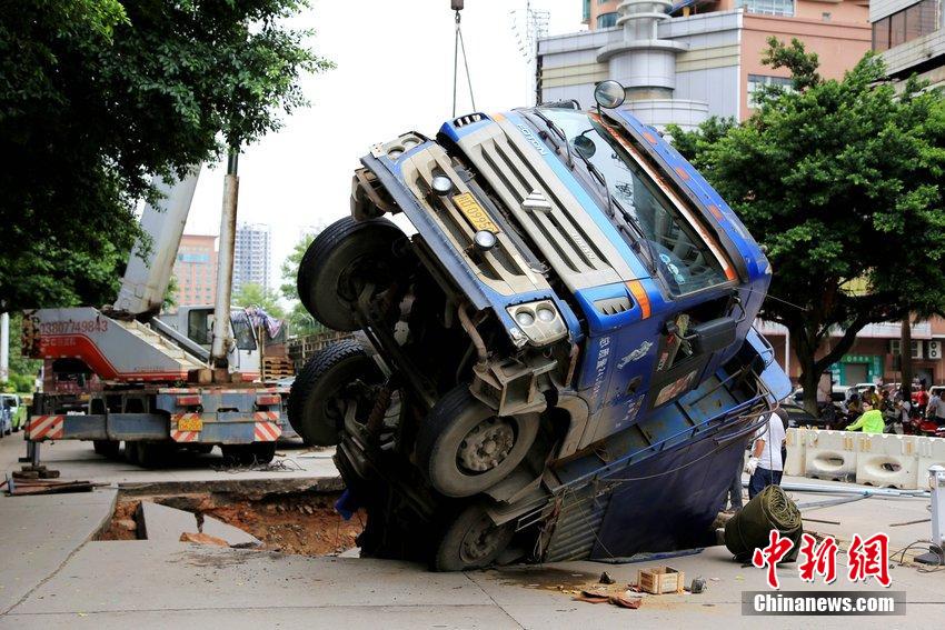 2014年8月14日,广西梧州一市区路段塌陷现场,一辆货车陷于塌陷形成的深坑中。当日凌晨,广西梧州市新兴二路一路段发生道路塌陷事故,一辆经过的大货车陷于塌陷形成的深坑中。 图片来源:CFP视觉中国