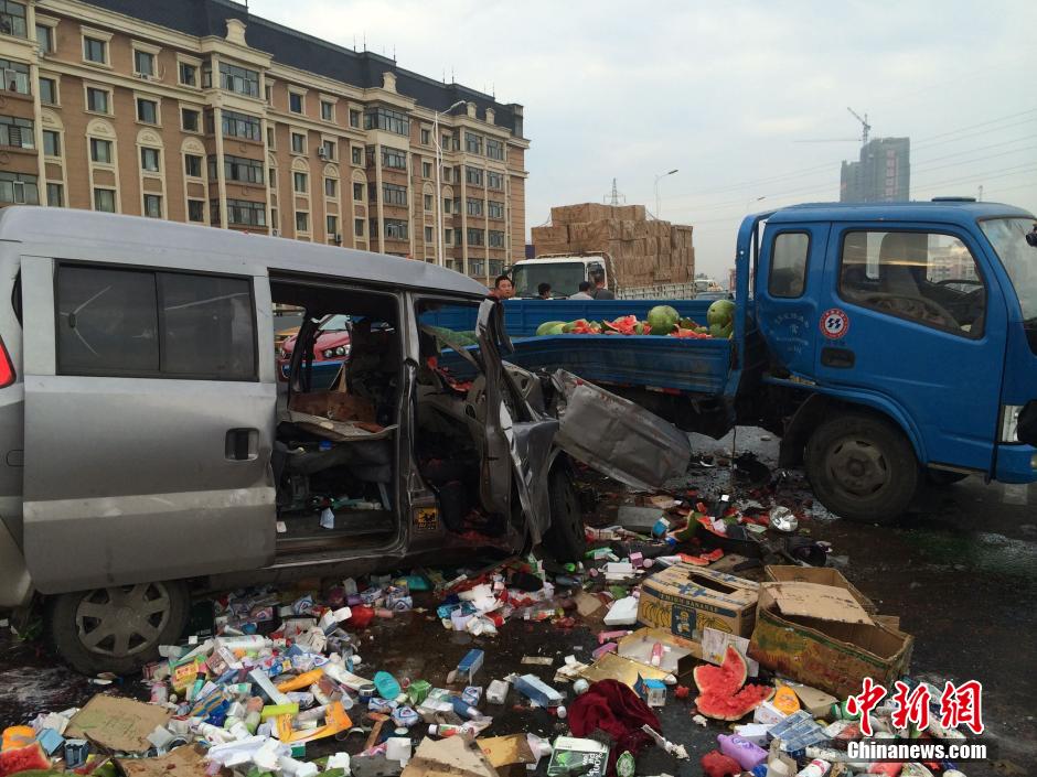 15日5时30分许,哈尔滨市文昌桥海城街下桥口处一辆面包车与一辆货车相撞,造成1人死亡,1人重伤。 中新社发 解培华 摄