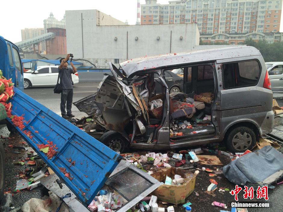 15日5时30分许,哈尔滨市文昌桥海城街下桥口处一辆面包车与一辆货车相撞,造成1人死亡,1人重伤。 中新社发 解培华 摄