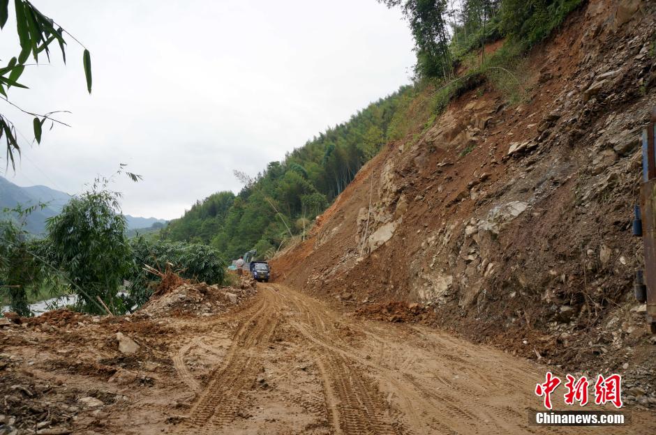 受8月11日至12日强降雨影响,广西桂林市龙胜各族自治县龙脊景区内出现山体滑坡,多处公路塌方,交通中断,导致四五百名中外游客被困在景区内,近百辆车滞留。14日17时30分,塌方路段公路已抢通,被困在此三天的游客开始陆续离开景区。图为塌方路段。中新社发 杨陈 摄