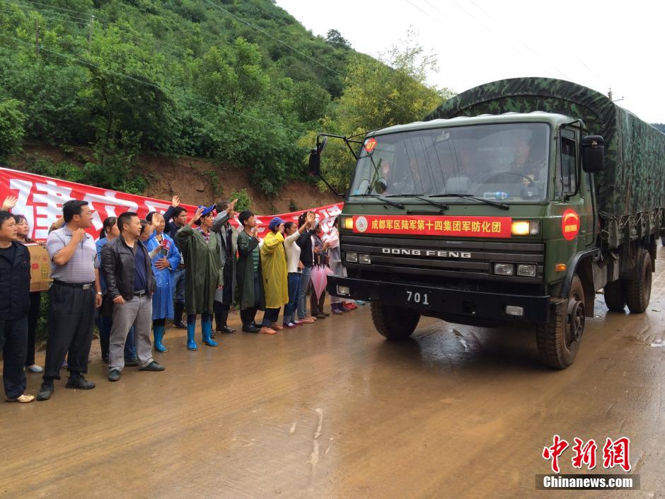 8月18日,参与鲁甸地震救援的部队撤离震中龙头山镇,当地民众夹道洒泪送别。中新社发 刘念 摄