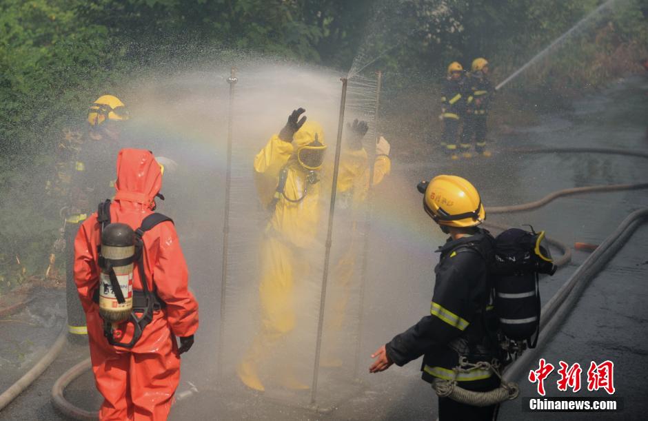 8月18日,身穿危化服的消防官兵进行现场清洗。当日,四川消防开展企业危化火灾实战演练。旨在通过实战演练,及时发现部队救援过程中存在的问题,锻炼和增强官兵处置大跨度大空间厂房火灾的应急救援能力,提高部队灭火救人、协同作战等实战化水平,增强大规模事故灾害部门联动能力。据悉,当地还将开展系列的实战灭火、救援等演练。中新社发 刘忠俊 摄
