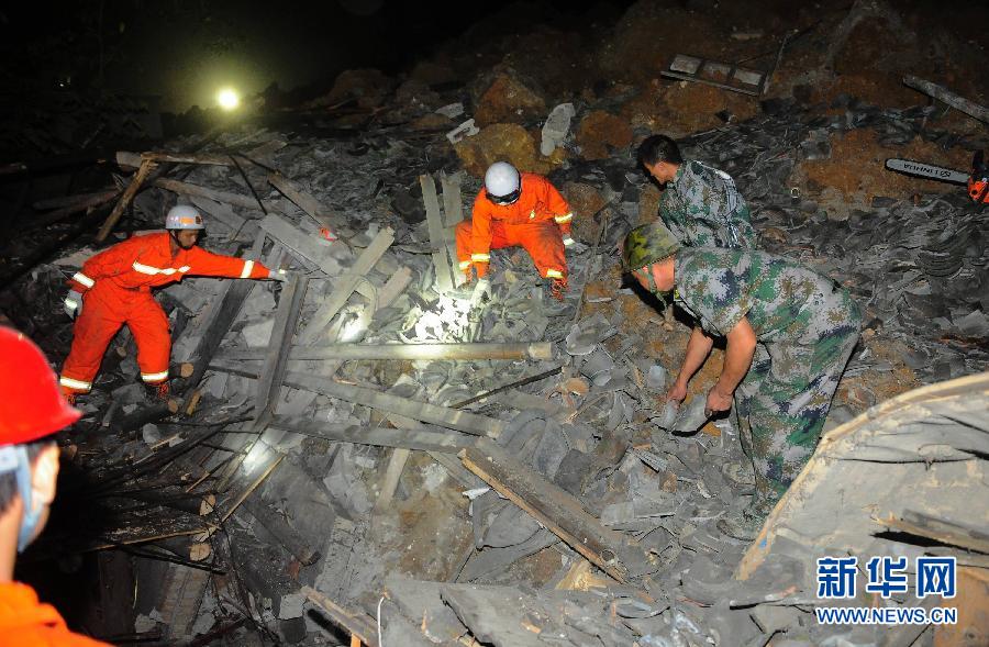 8月28日,救援人员在福泉市山体滑坡现场施救。截至28日6时,贵州省黔南州福泉市道坪镇英坪村发生的山体滑坡已确认6人死亡、22人受伤,此外还有21人失去联系。目前现场救援和灾情核查正在紧张进行。 8月27日20时许,贵州福泉市道坪镇英坪村小坝组发生山体滑坡。据初步统计,山体滑坡导致山下的小坝组和拦马坳组68户77栋房屋倒塌或被埋,154人受灾。目前22名伤者已被转移至福泉市和道坪镇医院进行救治,暂无生命危险。新华社发(吴儒波 摄)