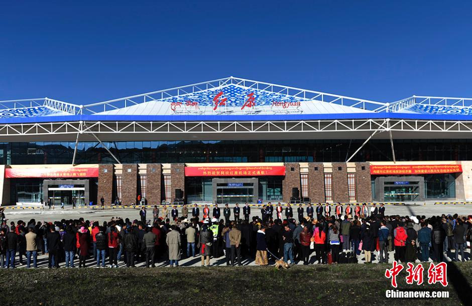 8月28日上午8时17分,随着从四川成都飞来的中国国际航空公司空中客车A319飞机平稳降落在阿坝红原机场,标志着该机场的首条航线——成都至红原航线顺利开通,红原机场正式投入运营,阿坝红原机场位于四川省阿坝州红原县境内,距县城48公里,海拔高度3535米,跑道长度3600米,属4C级。国航西南分公司使用高原机型空中客车A319客机执行,每天一班。空中飞行时间1个小时左右。图为四川阿坝藏族民众盛装迎接首航。安源 摄