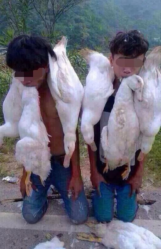 【广西两少年偷鸭被抓村民命其嘴咬鸭颈下跪】8月25日,宜州市庆远镇六坡村两名约14岁的少年,在村中偷鸭并被村民逮了个正着。抓住两人后,村民们没有报警,而是对两少年进行了体罚,每人“挂着”三只鸭子跪在路边。
