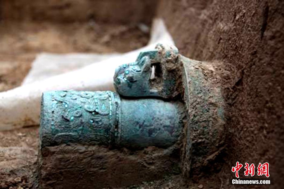 近日,考古人员在陕西省宝鸡市岐山县周原遗址附近发现一座西周中晚期车马坑,车辖、车輨、车軎相继露出,兽面纹车軎镶嵌精美绿松石。中新社发 陕西文物局 供图