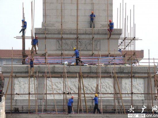 2014年08月29日下午,北京天安门广场,工人开始在人民英雄纪念碑四周搭建脚手架,准备对人民英雄纪念碑进行全面清洗,以清洁的容貌迎接中国人民共和国建国65周年国庆的到来。