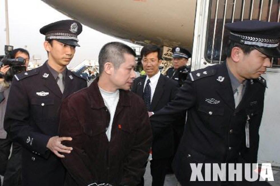 4月16日,中国警方在北京首都国际机场对被美国警方押送回国的犯罪嫌疑人、原中国银行广东省开平支行行长余振东执行逮捕。新华社记者袁满摄