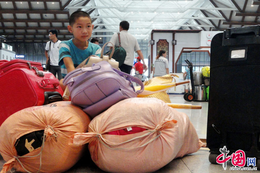 8月31日,一名小朋友在江苏苏州火车站候车大厅内等候乘车。 王建康摄影