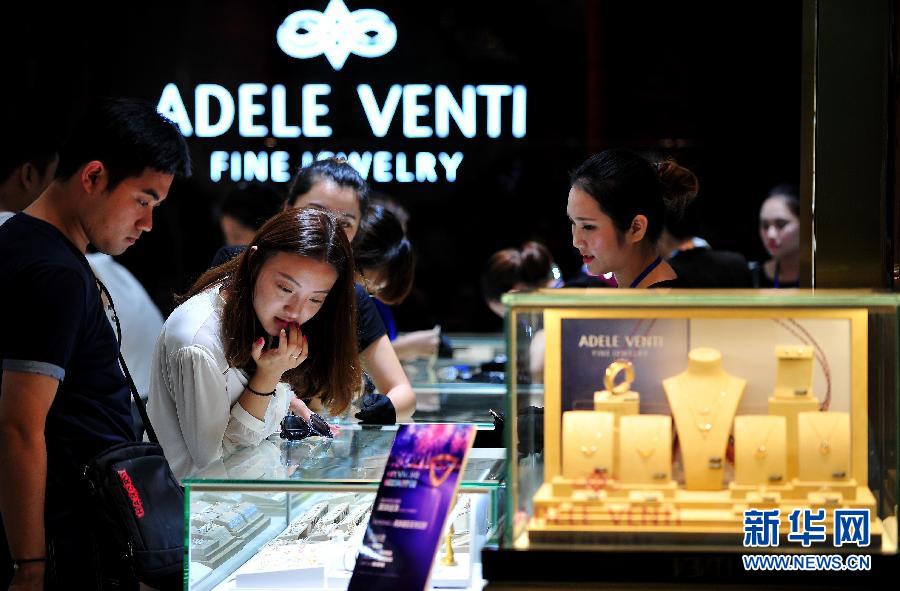 9月1日,游客在三亚海棠湾免税购物中心选购珠宝。当日,全球最大单体免税店三亚海棠湾免税购物中心正式开业。海棠湾免税购物中心总建筑面积约12万平方米,商业面积达7.2万平方米,投入运营的一期商业面积占总商业面积的近90%,二期将在2015年春节前后投入运营。据介绍,海棠湾免税购物中心共计引进近300个国际知名品牌。新华社记者郭程摄