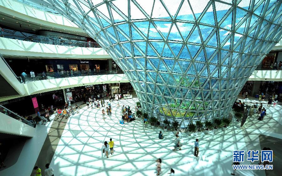 这是三亚海棠湾免税购物中心内部(9月1日摄)。 9月1日,全球最大单体免税店三亚海棠湾免税购物中心正式开业。海棠湾免税购物中心总建筑面积约12万平方米,商业面积达7.2万平方米,投入运营的一期商业面积占总商业面积的近90%,二期将在2015年春节前后投入运营。据介绍,海棠湾免税购物中心共计引进近300个国际知名品牌。新华社记者郭程摄