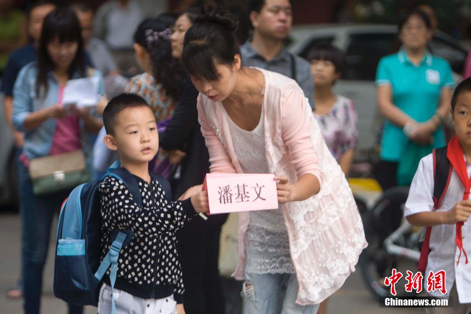 9月1日,山西太原,某小学新入学的小学生拿着自己名字的座签入学。当日,中国多地学校迎来新学期开学日。中新社发 张云 摄