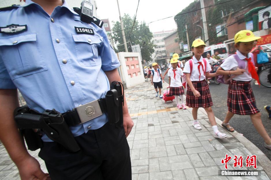 9月1日,济南中小学新学期开学首日,巡警配戴92式手枪、催泪喷射器等装备在济南青龙街小学校门口执勤,为小学生保驾护航。中新社发 张勇 摄