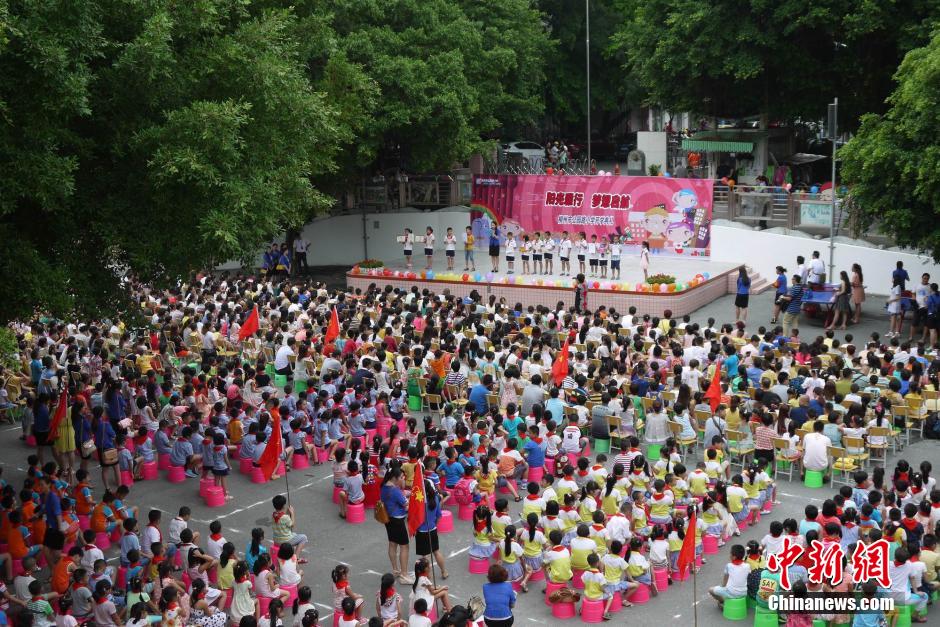 9月1日,是全国中小学校开学的第一天,广西柳州市公园路小学邀请一年级家长与孩子一块出席开学典礼,体验开笔礼、朱砂启智等中华传统开学仪式,还参加拥抱礼、父母教握笔等亲子项目,让家长陪同孩子经历义务教育的起点阶段。图为9月1日,广西柳州市公园路小学举行开学典礼。 王运鹏 摄