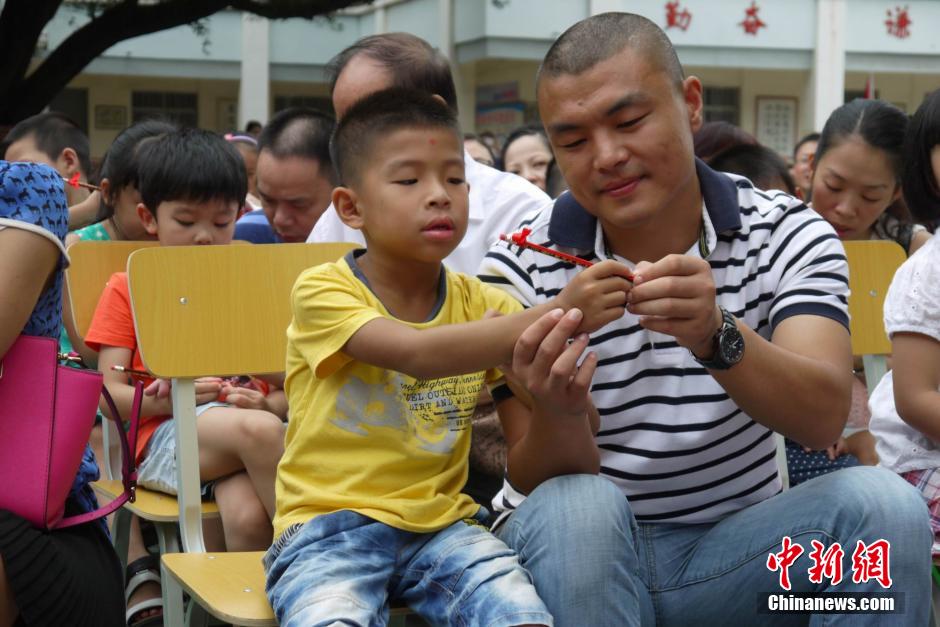 9月1日,广西柳州市公园路小学举行开学典礼,家长教孩子正确握笔。 王运鹏 摄