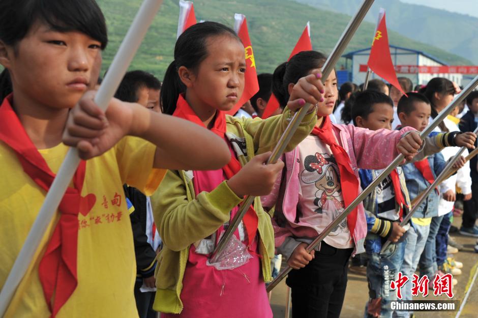 9月1日,震中龙泉中学开学仪式。当日,云南鲁甸龙头山镇中、小学在新建的板房校园内举行了开学仪式,据了解,灾区受地震影响的549所学校均按时正常开学。中新社发 任东 摄