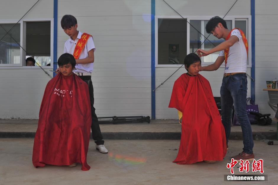 9月1日,震中龙泉中学,志愿者为学生免费理发。当日,云南鲁甸龙头山镇中、小学在新建的板房校园内举行了开学仪式,据了解,灾区受地震影响的549所学校均按时正常开学。中新社发 任东 摄