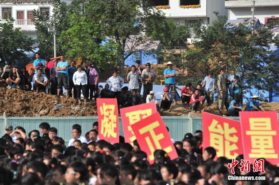 9月1日,震中龙泉中学开学仪式,学生父母在一旁观看。当日,云南鲁甸龙头山镇中、小学在新建的板房校园内举行了开学仪式,据了解,灾区受地震影响的549所学校均按时正常开学。中新社发 任东 摄