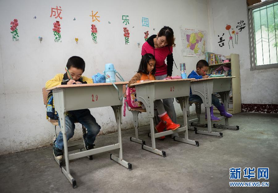 9月1日,新场小学一年级的语文课老师王芝在对三名新生邵德恒(左)、张东蕊(中)、陈善涛进行辅导。当日是各中小学校开学的日子,位于秦岭中段南麓的陕西省宁陕县新场小学也迎来了一年级的3名新生——张东蕊、陈善涛和邵德恒。由于新场镇地理位置偏远,常住人口较少,全镇目前只有一所中心小学,加上幼儿园学生也仅有38人,每个年级的学生都只有个位数。虽然今年的一年级学生只有3人,但是学校对孩子们的课程安排却一点也不少,全校7名老师都会给这3名学生上课。新华社记者 刘潇 摄