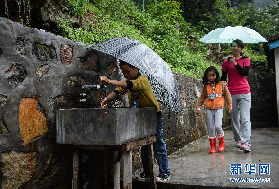 9月1日,课间休息,新场小学一年级的语文课老师王芝带着邵德恒(左一)、张东蕊去卫生间。当日是各中小学校开学的日子,位于秦岭中段南麓的陕西省宁陕县新场小学也迎来了一年级的3名新生——张东蕊、陈善涛和邵德恒。由于新场镇地理位置偏远,常住人口较少,全镇目前只有一所中心小学,加上幼儿园学生也仅有38人,每个年级的学生都只有个位数。虽然今年的一年级学生只有3人,但是学校对孩子们的课程安排却一点也不少,全校7名老师都会给这3名学生上课。新华社记者 刘潇 摄