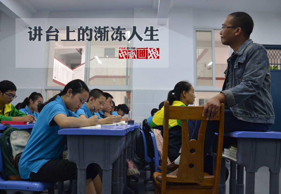 9月1日,开学第一天,四川省泸州市第七中学的教室里,詹光伟老师只能坐在课桌上授课,细心的同学发现,老师的手已经很少抬起。在刚刚过去的暑假里,一项名为“冰桶挑战”的公益活动传遍全球。詹光伟便是该活动的主角——运动神经元进行性肌肉萎缩症患者,俗称渐冻人。21年前的今天,意气风发的詹光伟迈出大学校门后正式踏上讲台。从独立行走到搀扶挪动,再到今天的寸步难行,他人生所有的时光和美好都在这里。图为詹光伟坐在课桌上上课。课桌成为了詹光伟的讲台。中新社发 周亚强 摄