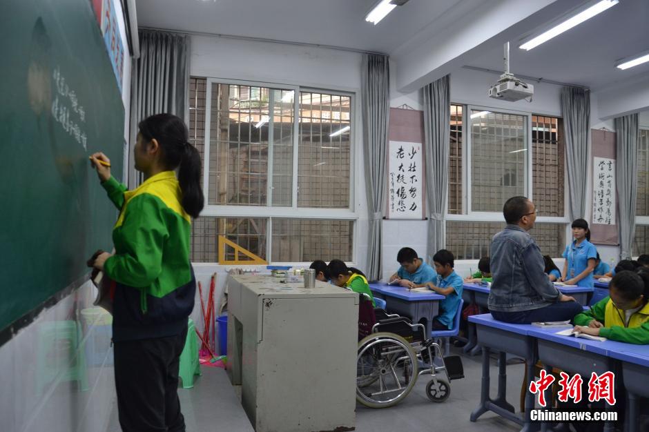 9月1日,开学第一天,四川省泸州市第七中学的教室里,詹光伟老师只能坐在课桌上授课,细心的同学发现,老师的手已经很少抬起。在刚刚过去的暑假里,一项名为“冰桶挑战”的公益活动传遍全球。詹光伟便是该活动的主角——运动神经元进行性肌肉萎缩症患者,俗称渐冻人。21年前的今天,意气风发的詹光伟迈出大学校门后正式踏上讲台。从独立行走到搀扶挪动,再到今天的寸步难行,他人生所有的时光和美好都在这里。图为詹光伟坐在课桌上上课。詹光伟上课时,学生帮忙写板书。中新社发 周亚强 摄