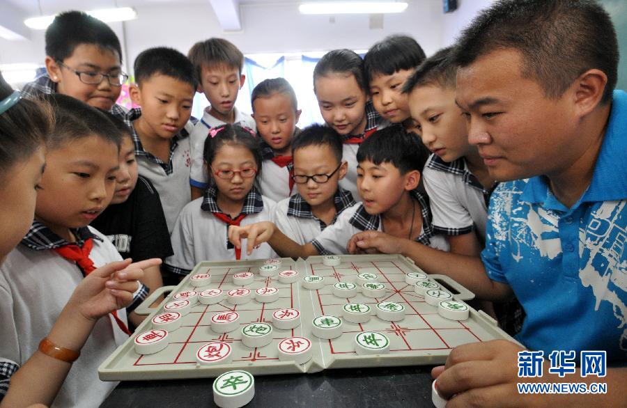 9月1日下午,放学后,河北省邯郸市丛台小学的学生与老师(右一)在教室里下象棋。从今年9月1日开始,河北省邯郸市主城区和县城小学全面实行“弹性离校制度”,县镇及农村小学可结合实际参照执行。对按时离校确实有困难的学生推迟离校时间,学校组织开展免费的以自习、做作业为主的课后托管活动,不补课、不上新课、不组织社团活动。冬季下午弹性离校时间由16:40延后到17:30;夏季下午弹性离校时间由17:10延后到18:00。新华社发(郝群英 摄)