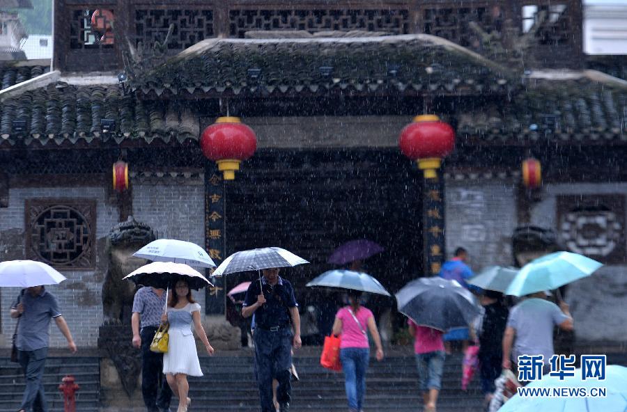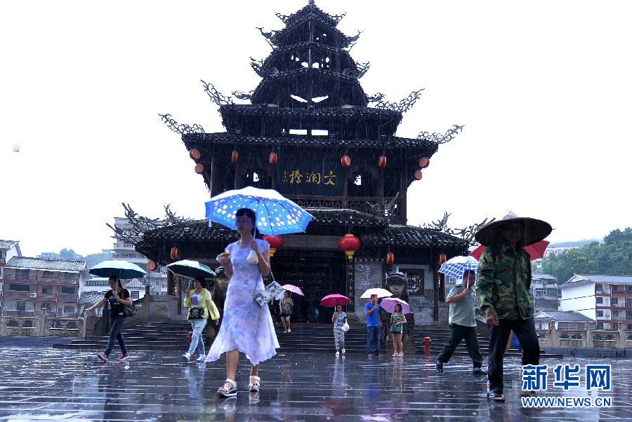 9月2日,湖北省宣恩县城区风雨桥头,人们在雨中行走。当日4时,湖北恩施气象台日发布暴雨红色预警信号。 新华社发(宋文 摄)
