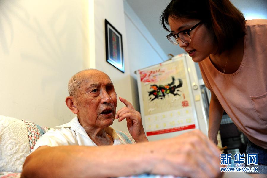 李华贵跟孙女在一起(8月22日摄)。今年95岁的李华贵出生于安徽肥东,10多岁时因家庭贫困前往上海做工。上海沦陷后,李华贵流离失所,1943年加入新四军,跟随部队在安徽和江苏边境与日军作战,与战友缴获过日本大炮,还俘虏日军24名。在战争生涯中,李华贵多次负伤,失去一只眼睛。新中国成立后,他回到安徽合肥,先后在安徽省民政厅和合肥化机厂工作,直至退休。 新华社记者刘军喜摄
