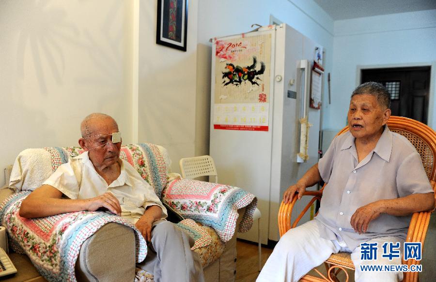 李华贵和爱人在住所里(8月22日摄)。今年95岁的李华贵出生于安徽肥东,10多岁时因家庭贫困前往上海做工。上海沦陷后,李华贵流离失所,1943年加入新四军,跟随部队在安徽和江苏边境与日军作战,与战友缴获过日本大炮,还俘虏日军24名。在战争生涯中,李华贵多次负伤,失去一只眼睛。新中国成立后,他回到安徽合肥,先后在安徽省民政厅和合肥化机厂工作,直至退休。 新华社记者刘军喜摄