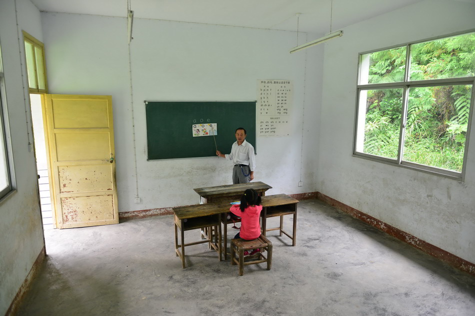 随着附近村子进城务工的年轻人增多,子女随父母进城上学,这所学校的学生越来越少。从2008年起,这所学校的学生不到10人,从教36年、53岁的谢世魁老师独自承担起所有的教学任务,一直坚守到今天。新华社发(杨顺丕 摄)