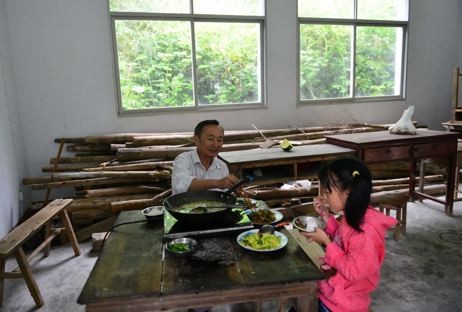 9月1日,湖北恩施龙凤镇大龙潭村杉树湾教学点的谢世魁老师和学生刘欣怡一起吃午饭。