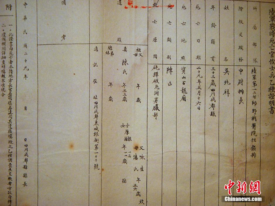 图为成都市档案馆内保存的抗战牺牲将士阵亡通知书。成都市档案馆提供