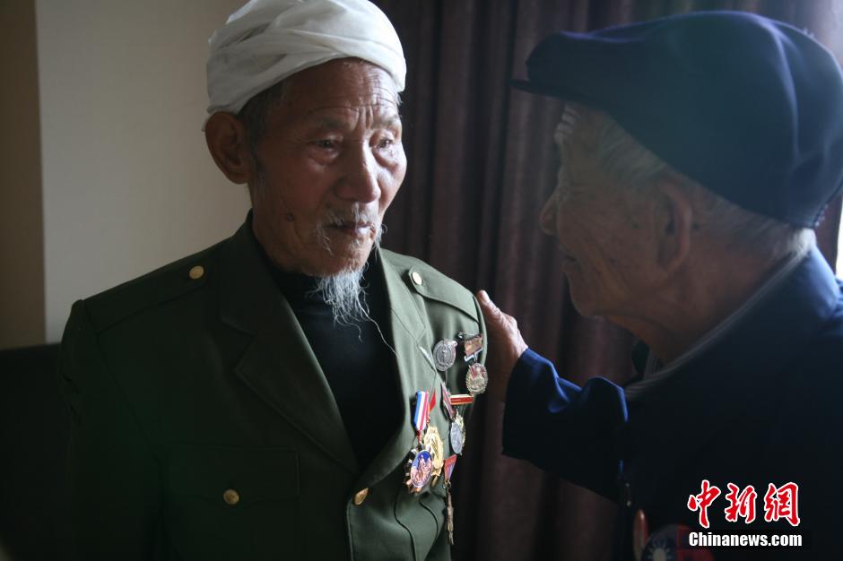 图为抗战老兵互致问候。中新社发 缪超 摄