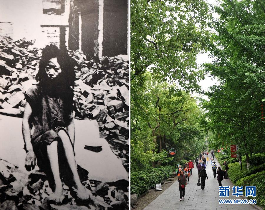 左图:遭受侵华日军轰炸后,一名难民坐在已经变成废墟的桂林街头(资料照片)。右图:市民游客在桂林市榕湖边游览观光(2013年4月21日摄)。