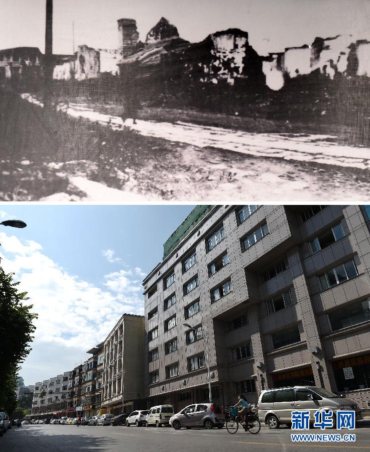 上图:这是被侵华日军炸毁的桂林市五美路的景象(资料照片)。 下图:9月1日,市民骑车从桂林市五美路经过。新华社记者 陆波岸摄
