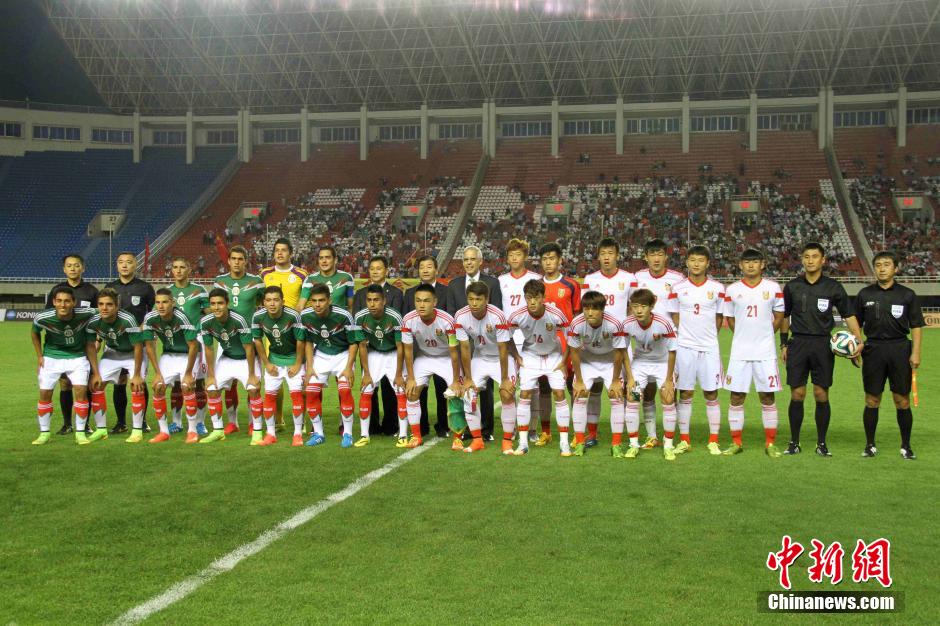 3日晚间,2014国际青年足球邀请赛首轮第2场,中国U19国青队对阵墨西哥U19国青队的比赛,双方经过90分钟激战,中国队1:0小胜对手。中新社发 张一辰 摄