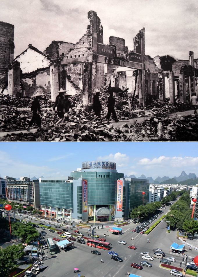上图:这是被侵华日军飞机轰炸后桂林市十字街的景象(资料照片)。下图:这是9月1日拍摄的桂林市十字街繁华的景象。